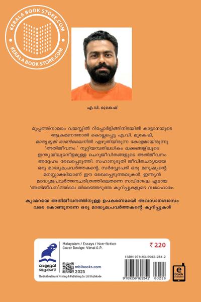 മുപ്പത്തിനാലാം വയസ്സില് റിപ്പോര്ട്ടിങ്ങിനിടയില് കാട്ടാനയുടെ ആക്രമണത്താല് കൊല്ലപ്പെട്ട എ.വി. മുകേഷ്, മാതൃഭൂമി ഓണ്ലൈനില് എഴുതിയിരുന്ന കോളമായിരുന്നു ‘അതിജീവനം.’ നൂറ്റിയമ്പതിലധികം ലക്കങ്ങളിലൂടെ ഇന്ത്യയിലുടനീളമുള്ള ചെറുജീവിതങ്ങളുടെ അതിജീവനം അദ്ദേഹം രേഖപ്പെടുത്തി. സഹാനുഭൂതി ജീവിതചര്യയായ ഒരു മാദ്ധ്യമപ്രവര്ത്തകന്റെ, സര്വ്വോപരി ഒരു മനുഷ്യന്റെ മനസ്സാക്ഷിയാണ് ഈ രേഖപ്പെടുത്തലുകള്. ഇന്ത്യന് മാദ്ധ്യമപ്രവര്ത്തനചരിത്രത്തിലെതന്നെ സവിശേഷ ഏടായ ‘അതിജീവന’ത്തിലെ തിരഞ്ഞെടുത്ത കുറിപ്പുകളുടെ സമാഹാരം.