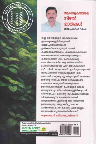 വായിച്ചുതുടങ്ങിയാൽ ഉൽക്കണ്ഠയോടുകൂടി നമ്മൾ കഥയ്ക്കകത്താകും. കഥയ്ക്കകത്തേക്ക് വായനക്കാരനെ കൊണ്ടുപോകുന്ന കരവിരുതാണ് ഒരു കഥാകാരൻ്റെ യഥാർത്ഥ പ്രതിഭ. ആ അർത്ഥത്തിൽ പ്രതിഭാശാലിയായ എഴുത്തുകാരനാണ് ശ്രീ. വി.പി. ജയപ്രകാശ്. ഇനിയുമെഴുതാൻ അദ്ദേഹത്തിന് സാധിക്കുമെന്ന് ഈ നോവൽ നമുക്കുറപ്പു തരുന്നുണ്ട്. കാരണം ഇതിന്റെ ശില്പം അത്ര ഭാവഭദ്രമാണ്. പറയേണ്ട കാര്യത്തിലേക്കുമാത്രം ഊന്നിക്കൊണ്ടാണ് രചനയുടെ ഓരോ അദ്ധ്യായവും നിബദ്ധിക്കപ്പെട്ടിരിക്കുന്നത്. വിശേഷിച്ചും കാടിൻ്റെ സൂക്ഷ്മാംശങ്ങളെ വിശദമാക്കുന്ന ഭാഗങ്ങൾ നമ്മൾ കാട്ടിലെത്തിപ്പെട്ടതിൻ്റെ ഒരു തോന്നൽ ഉണ്ടാക്കുന്നു. അട്ട കടിച്ചു ചോര വാർന്നൊഴുകുന്ന മകൻ്റെ ചിത്രമെല്ലാം അത്രമേൽ ഹൃദയസ്പർശിയാണ്.Write a review on this book!. Write Your Review about ആരണ്യകത്തിലെ നിഴൽപ്പാതകൾ Other InformationThis book has been viewed by users 14 times