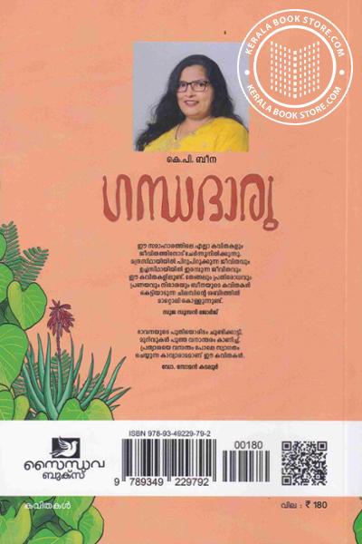 ഈ സമാഹാരത്തിലെ എല്ലാ കവിതകളും ജീവിതത്തിനോട് ചേർന്നുനിൽക്കുന്നു. മന്ദ്രസ്ഥായിയിൽ പിറുപിറുക്കുന്ന ജീവിതവും ഉച്ചസ്ഥായിയിൽ ഇരമ്പുന്ന ജീവിതവും ഈ കവിതകളിലുണ്ട്. തേങ്ങലും പ്രതിരോധവും പ്രണയവും നിരാശയും ബീനയുടെ കവിതകൾ കെട്ടിയാടുന്ന ചിലമ്പിന്റെ ശബ്ദത്തിൽ മാറ്റൊലി കൊള്ളുന്നുണ്ട്.Write a review on this book!. Write Your Review about ഗന്ധദാരു Other InformationThis book has been viewed by users 35 times