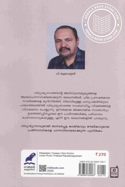 വിദ്യാഭ്യാസത്തിൻ്റെ അടിസ്ഥാനമൂല്യങ്ങളെ ആലോചനാവിഷയമാക്കുന്ന ലേഖനങ്ങൾ. ചില പ്രസക്തമായ സന്ദർഭങ്ങളെ മുൻനിർത്തി, നിലവിലുള്ള പാഠ്യപദ്ധതിയുടെ പശ്ചാത്തലത്തിൽ വിദ്യാഭ്യാസത്തെ സംബന്ധിച്ച വിഷയങ്ങളെ വിശകലനം ചെയ്യുന്നു. ഉന്നതമായ അക്കാദമിക സ്വാതന്ത്ര്യം ഉയർത്തിപ്പിടിച്ചാലേ ഈ പ്രശ്നങ്ങൾക്കു പരിഹാരം കാണാനാവുകയുള്ളൂ എന്ന് ഈ ലേഖനങ്ങളിൽ പറയുന്നു.