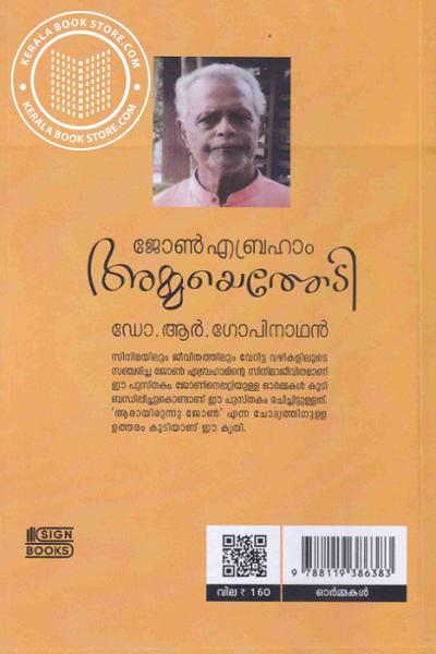 സിനിമയിലും ജീവിതത്തിലും വേറിട്ട വഴികളിലൂടെ സഞ്ചരിച്ച ജോൺ എബ്രഹാമിൻ്റെ സിനിമാജീവിതമാണ് ഈ പുസ്തകം. ജോണിനെപ്പറ്റിയുള്ള ഓർമ്മകൾ കുടി ബന്ധിപ്പിച്ചുകൊണ്ടാണ് ഈ പുസ്തകം രചിച്ചിട്ടുള്ളത്. ’ആരായിരുന്നു ജോൺ’ എന്ന ചോദ്യത്തിനുള്ള ഉത്തരം കൂടിയാണ് ഈ കൃതി.Write a review on this book!. Write Your Review about ജോൺ എബ്രഹാം അമ്മയെത്തേടി Other InformationThis book has been viewed by users 19 times
