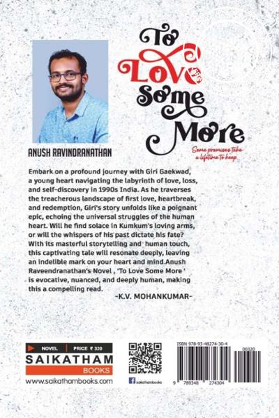 Embark on a profound journey with Giri Gaekwad, a young heart navigating the labyrinth of love, loss, and self-discovery in 1990s India. As he traverses the treacherous landscape of first love, heartbreak, and redemption, Giri’s story unfolds like a poignant epic, echoing the universal struggles of the human heart. Will he find solace in Kumkum’s loving arms, or will the whispers of his past dictate his fate? With its masterful storytelling and human touch, this captivating tale will resonate deeply, leaving an indelible mark on your heart and mind.Anush Raveendranathan’s Novel , ’To Love Some More ’ is evocative, nuanced, and deeply human, making this a compelling read.Write a review on this book!. Write Your Review about ടു ലവ് സം മോർ Other InformationThis book has been viewed by users 19 times