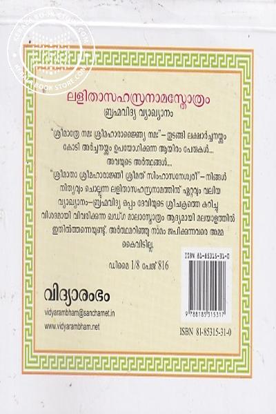 “ശ്രീമാതാ ശ്രീമഹാരാജ്ഞി ശ്രീമത് സിംഹാസനേശ്വരീ - നിങ്ങൾ നിത്യവും ചൊല്ലുന്ന ലളിതാസഹസ്രനാമത്തിനു് ഏറ്റവും വലിയ വ്യാഖ്യാനം-ബ്രഹ്മവിദ്യ ഒപ്പം ദേവിയുടെ ശ്രീചക്രത്തെ കുറിച്ചു വിശദമായി വിവരിക്കുന്ന ഖഡ്ഗ മാലാസ്തോത്രം ആദ്യമായി മലയാളത്തിൽ ഇതിൽത്തന്നെയുണ്ടു്. അർത്ഥമറിഞ്ഞു നാമം ജപിക്കുന്നവരെ അമ്മ കൈവിടില്ല.Write a review on this book!. Write Your Review about ദേവീസ്തോത്രരത്നാകരം Other InformationThis book has been viewed by users 8 times