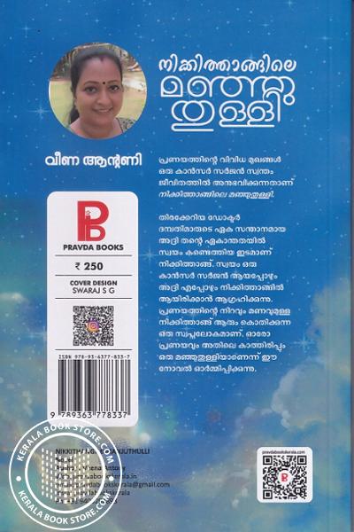പ്രണയത്തിന്റെ വിവിധ മുഖങ്ങൾ ഒരു കാൻസർ സർജൻ സ്വന്തം ജീവിതത്തിൽ അനുഭവിക്കുന്നതാണ് നിക്കിത്താങ്ങിലെ മഞ്ഞുതുള്ളി. തിരക്കേറിയ ഡോക്ടർ ദമ്പതിമാരുടെ ഏക സന്താനമായ അദ്രി തന്റെ ഏകാന്തതയിൽ സ്വയം കണ്ടെത്തിയ ഇടമാണ് നിക്കിത്താങ്ങ്. സ്വയം ഒരു കാൻസർ സർജൻ ആയപ്പോഴും അദ്രി എപ്പോഴും നിക്കിത്താങ്ങിൽ ആയിരിക്കാൻ ആഗ്രഹിക്കുന്നു. പ്രണയത്തിന്റെ നിറവും മണവുമുള്ള നിക്കിത്താങ്ങ് ആരും കൊതിക്കുന്ന ഒരു സ്വപ്നലോകമാണ്. ഓരോ പ്രണയവും അതിലെ കാത്തിരിപ്പും ഒരു മഞ്ഞുതുള്ളിയാണെന്ന് ഈ നോവൽ ഓർമ്മിപ്പിക്കുന്നു.Write a review on this book!. Write Your Review about നിക്കിത്താങ്ങിലെ മഞ്ഞുതുള്ളി Other InformationThis book has been viewed by users 124 times