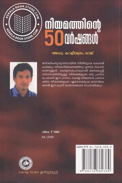 ജനാധിപത്യവ്യവസ്ഥയിൽ നീതിന്യായ കോടതി കൾക്കും നിയമനിർമാണത്തിനും ഉന്നത സ്ഥാന മാണുള്ളത്. കേരളസമൂഹവുമായി ബന്ധപ്പെട്ട് തയാറാക്കിയിട്ടുള്ള നിയമങ്ങളുടെ ഒരു ഹ്രസ്വ രൂപമാണ് ഈ ഗ്രന്ഥം. കേരള നിയമസഭ പാസാ ക്കിയ നിയമങ്ങളുടെ ഏകദേശരൂപം മനസിലാ ക്കാൻ ഈ കൃതി വായനക്കാരെ സഹായിക്കും.Write a review on this book!. Write Your Review about നിയമത്തിന്റെ 50 വർഷങ്ങൾ Other InformationThis book has been viewed by users 36 times