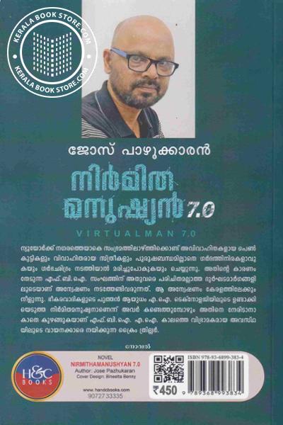 ന്യൂയോർക്ക് നഗരത്തെയാകെ സംഭ്രമത്തിലാഴ്ത്തിക്കൊണ്ട് അവിവാഹിതകളായ പെൺ കുട്ടികളും വിവാഹിതരായ സ്ത്രീകളും പുരുഷബന്ധമില്ലാതെ ഗർഭത്തിനിരകളാവു കയും ഗർഭഛിദ്രം നടത്തിയാൽ മരിച്ചുപോകുകയും ചെയ്യുന്നു. അതിൻ്റെ കാരണം തേടുന്ന എഫ്.ബി.ഐ. സംഘത്തിന് അതുവരെ പരിചിതമല്ലാത്ത ദുർഘടമാർഗങ്ങളി ലൂടെയാണ് അന്വേഷണം നടത്തേണ്ടിവരുന്നത്. ആ അന്വേഷണം കേരളത്തിലേക്കും നീളുന്നു. ഭീകരവാദികളുടെ പുത്തൻ ആയുധം എ. ഐ. ടെക്നോളജിയിലൂടെ ഉണ്ടാക്കി യെടുത്ത നിർമിതമനുഷ്യനാണെന്ന് അവർ കണ്ടെത്തുമ്പോഴും അതിനെ നേരിടാനാ കാതെ കുഴങ്ങുകയാണ് എഫ്.ബി.ഐ. എ.ഐ. കാലത്തെ വിഭ്രാമകമായ അവസ്ഥ യിലൂടെ വായനക്കാരെ നയിക്കുന്ന ക്രൈം ത്രില്ലർWrite a review on this book!. Write Your Review about നിർമിത മനുഷ്യൻ 7.0 Other InformationThis book has been viewed by users 13 times