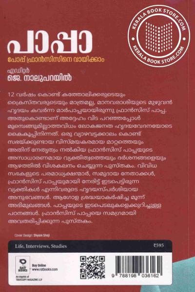 12 വർഷം കൊണ്ട് കത്തോലിക്കരുടെയും ക്രൈസ്തവരുടെയും മാത്രമല്ല, മാനവരാശിയുടെ മുഴുവൻ ഹൃദയം കവർന്ന മാർപാപ്പയായിരുന്നു ഫ്രാൻസിസ് പാപ്പ. അതുകൊണ്ടാണ് അദ്ദേഹം വിട പറഞ്ഞപ്പോൾ മുമ്പെങ്ങുമില്ലാത്തവിധം ലോകജനത ഹൃദയവേദനയോടെ കൈകൂപ്പിനിന്നത്. ഒരു വ്യാഴവട്ടക്കാലം കൊണ്ട് സഭയ്ക്കുണ്ടായ വിസ്മയകരമായ മാറ്റത്തെയും അതിന് നേതൃത്വം നൽകിയ ഫ്രാൻസിസ് പാപ്പയുടെ അസാധാരണമായ വ്യക്തിത്വത്തെയും ദർശനങ്ങളെയും ആഴത്തിൽ വിശകലനം ചെയ്യുന്ന പുസ്തകം. വിവിധ സഭകളുടെ പരമാധ്യക്ഷന്മാർ, സമുദായ നേതാക്കൾ, ഫ്രാൻസിസ് പാപ്പയുമായി നേരിട്ട് ഇടപെട്ടിരുന്ന വ്യക്തികൾ എന്നിവരുടെ ഹൃദയസ്പർശിയായ അനുഭവങ്ങൾ. ആഗോള ശ്രദ്ധയാകർഷിച്ച മൂന്ന് അഭിമുഖങ്ങൾ. പാപ്പയുടെ ഇടപെടലുകളെക്കുറിച്ചുള്ള പഠനങ്ങൾ. ഫ്രാൻസിസ് പാപ്പയെ സമഗ്രമായി അവതരിപ്പിക്കുന്ന പുസ്തകം.Write a review on this book!. Write Your Review about പാപ്പാ - പോപ്പ് ഫ്രാൻസിസിനെ വായിക്കാം Other InformationThis book has been viewed by users 22 times