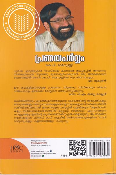 “രാമനുണ്ണി തന്റെ കഥകളിലും നോവലുകളിലും ആവിഷ്കരിക്കുന്ന ആശയങ്ങള് ഏതെങ്കിലും പ്രസ്താനത്തിന്റെയോ തലമുറയിലെയോ ചുറ്റുവട്ടത്തില് ഒതുങ്ങി നില്ക്കുന്നതല്ല. കാലത്തെ മറികടക്കുന്ന എന്തോ ഒന്ന് രാമനുണ്ണിയുടെ കൃതികളില്, പ്രത്യേകിച്ച് നോവലുകളില് കാണാം.” - എം. മുകുന്ദന്Write a review on this book!. Write Your Review about പ്രണയപര്വ്വം Other InformationThis book has been viewed by users 3384 times