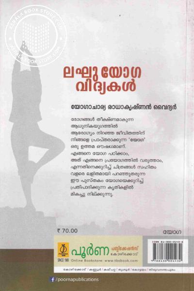 രോഗങ്ങള് തീക്ഷണമാകുന്ന ആധുനികയുഗത്തില് ആരോഗ്യം നിറഞ്ഞ ജീവിതത്തിന് നിങ്ങളെ പ്രാപ്തരാക്കുന്ന യോഗ ഒരു ഉത്തമ ഔഷധമാണ്. എങ്ങനെ യോഗ പഠിക്കാം, അത് ഏങ്ങനെ പ്രയോഗത്തില് വരുത്താം, എന്നതിനെക്കുറിച്ച് ചിത്രങ്ങള് സഹിതം വളരെ ലളിതമായി പറഞ്ഞുതരുന്ന ഈ പുസ്തകം യോഗയെക്കുറിച്ച് പ്രതിപാദിക്കുന്ന കൃതികളില് മികച്ചു നില്ക്കുന്നു. Write a review on this book!. Write Your Review about ലഘുയോഗ വിദ്യകള് Other InformationThis book has been viewed by users 2545 times