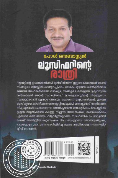 “ഇരുട്ടിന്റെ ഇടങ്ങൾ നിങ്ങൾ ഭൂമിയിൽനിന്ന് ഇല്ലാതാക്കുമ്പോൾ ഞാൻ നിങ്ങളുടെ മനസ്സിൽ കുടിയുറപ്പിക്കും. ലോകം മുഴുവൻ കാൽക്കീഴിലാണെന്ന് അഹങ്കരിക്കുന്ന മനുഷ്യാ, നിങ്ങളുടെ മനസ്സിൽ ദുഷ്ടതയുടെ വൻകരകൾ ഞാൻ സ്ഥാപിക്കും.“ മനുഷ്യമനസ്സിൻ്റെ നിയന്ത്രണം സ്വന്തമാക്കാൻ ഏതറ്റം വരെയും പോകുന്ന ദുഷ്ടശക്തികൾ. മൃഗങ്ങളോട് ക്രൂരത കാണിക്കുന്ന മനുഷ്യപ്പിശാചുക്കൾ മനുഷ്യരോട് അതിലേറെ നികൃഷ്ടമായി പെരുമാറുന്നു. അതിക്രൂരരായ മനുഷ്യർക്കും മനുഷ്യരിൽ ദുഷ്ടത വിളയിക്കാൻ കാത്തു നില്ക്കുന്ന അമാനുഷിക ശക്തികൾക്കും എതിരെ ഒരേ സമയം വിട്ടുവീഴ്ചയില്ലാത്ത സാഹസിക പോരാട്ടത്തിലാണ് അതിന്ദ്രീയ കുറ്റന്വേഷക ദീപ. സംത്രാസം നിറഞ്ഞുനില്ക്കുന്ന, പലപ്പോഴും ശ്വാസം അടക്കിപ്പിടിച്ചു മാത്രം വായിക്കാവുന്ന ഒരു ഡിറ്റക്ടീവ് നോവൽ.Write a review on this book!. Write Your Review about ലൂസിഫറിൻ്റെ രാത്രി Other InformationThis book has been viewed by users 22 times