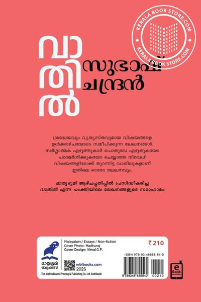 മാതൃഭൂമി ആഴ്ച്ചപ്പതിപ്പിൽ പ്രസിദ്ധീകരിച്ച വാതിൽ എന്ന പംക്തിയിലെ ലേഖനങ്ങളുടെ സമാഹാരം.Write a review on this book!. Write Your Review about വാതിൽ Other InformationThis book has been viewed by users 111 times