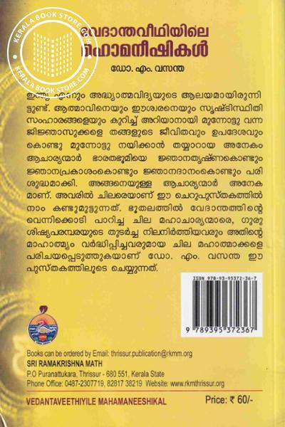 ഇന്ത്യ എന്നും അദ്ധ്യാത്മവിദ്യയുടെ ആലയമായിരുന്നി ട്ടുണ്ട്. ആത്മാവിനെയും ഈശ്വരനെയും സൃഷ്ടിസ്ഥിതി സംഹാരങ്ങളെയും കുറിച്ച് അറിയാനായി മുന്നോട്ടു വന്ന ജിജ്ഞാസുക്കളെ തങ്ങളുടെ ജീവിതവും ഉപദേശവും കൊണ്ടു മുന്നോട്ടു നയിക്കാൻ തയ്യാറായ അനേകം ആചാര്യന്മാർ ഭാരതഭൂമിയെ ജ്ഞാനതൃഷ്ണകൊണ്ടും ജ്ഞാനപ്രകാശംകൊണ്ടും ജ്ഞാനദാനംകൊണ്ടും പരി ശുദ്ധമാക്കി. അങ്ങനെയുള്ള ആചാര്യന്മാർ അനേക മാണ്. അവരിൽ ചിലരെയാണ് ഈ ചെറുപുസ്തകത്തിൽ നാം കണ്ടുമുട്ടുന്നത്. ഭൂതലത്തിൽ വേദാന്തത്തിന്റെ വെന്നിക്കൊടി പാറിച്ച ചില മഹാചാര്യന്മാരെ, ഗുരു ശിഷ്യപരമ്പരയുടെ തുടർച്ച നിലനിർത്തിയവരും അതിന്റെ മാഹാത്മ്യം വർദ്ധിപ്പിച്ചവരുമായ ചില മഹാത്മാക്കളെ പരിചയപ്പെടുത്തുകയാണ് ഡോ. എം. വസന്ത ഈ പുസ്തകത്തിലൂടെ ചെയ്യുന്നത്.Write a review on this book!. Write Your Review about വേദാന്തവീഥിയിലെ മഹാമനീഷികൾ Other InformationThis book has been viewed by users 19 times