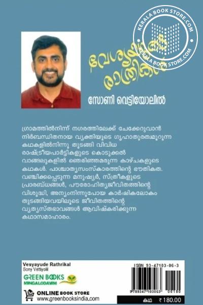 ഗ്രാമത്തിൽനിന്ന് നഗരത്തിലേക്ക് ചേക്കേറുവാൻ നിർബന്ധിതനായ വ്യക്തിയുടെ ഗൃഹാതുരത്വമുറുന്ന കഥകളിൽനിന്നു തുടങ്ങി വിവിധ രാഷ്ട്രീയപാർട്ടികളുടെ കൊടുക്കൽ വാങ്ങലുകളിൽ ഞെരിഞ്ഞമരുന്ന കാഴ്ചകളുടെ കഥകൾ. പാശ്ചാത്യസംസ്കാരത്തിന്റെ ഭൗതികത. വഞ്ചിക്കപ്പെടുന്ന മനുഷ്യർ, സ്ത്രീകളുടെ പ്രാരബ്ധങ്ങൾ, പൗരോഹിത്യജീവിതത്തിന്റെ വിശുദ്ധി, അന്യംനിന്നുപോയ കാർഷികലോകം തുടങ്ങിയവയിലൂടെ ജീവിതത്തിന്റെ വ്യത്യസ്തഭാവങ്ങൾ ആവിഷ്കരിക്കുന്ന കഥാസമാഹാരം.Write a review on this book!. Write Your Review about വേശ്യയുടെ രാത്രികള് Other InformationThis book has been viewed by users 17 times