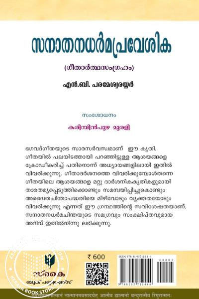 സനാതനധർമചിന്തയുടെ സമഗ്രവും സംക്ഷിപ്തവുമായ അറിവ് ഇതിൽനിന്നു ലഭിക്കുന്നു.Write a review on this book!. Write Your Review about സനാതനധർമപ്രവേശിക Other InformationThis book has been viewed by users 19 times