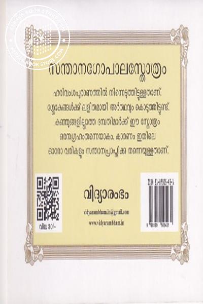 ഹരിവംശപുരാണത്തിൽ നിന്നെടുത്തിട്ടുള്ളതാണ്. ശ്ലോകങ്ങൾക്ക് ലളിതമായി അർത്ഥവും കൊടുത്തിട്ടുണ്ട്. കുഞ്ഞുങ്ങളില്ലാത്ത ദമ്പതിമാർക്ക് ഈ സ്തോത്രം ഒരനുഗ്രഹംതന്നെയാകും. കാരണം ഇതിലെ ഓരോ വരികളും സന്താനപ്രാപ്തിക്കു തന്നെയുള്ളതാണ്Write a review on this book!. Write Your Review about സന്താനഗോപാലസ്തോത്രം Other InformationThis book has been viewed by users 7 times