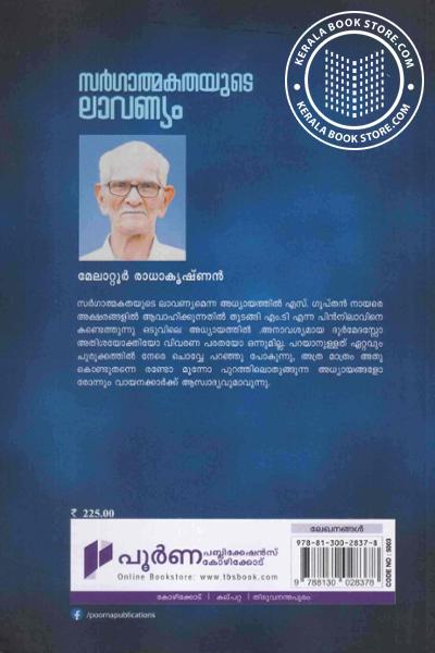 സർഗാത്മകതയുടെ ലാവണ്യമെന്ന അധ്യായത്തിൽ എസ്. ഗുപ്തൻ നായരെ അക്ഷരങ്ങളിൽ ആവാഹിക്കുന്നതിൽ തുടങ്ങി എം.ടി എന്ന പിൻനിലാവിനെ കണ്ടെത്തുന്നു ഒടുവിലെ അധ്യായത്തിൽ അനാവശ്യമായ ദുർമേദസ്സോ അതിശയോക്തിയോ വിവരണ പരതയോ ഒന്നുമില്ല. പറയാനുള്ളത് ഏറ്റവും ചുരുക്കത്തിൽ നേരെ ചൊവ്വേ പറഞ്ഞു പോകുന്നു. അത്ര മാത്രം അതു കൊണ്ടുതന്നെ രണ്ടോ മൂന്നോ പുറത്തിലൊതുങ്ങുന്ന അധ്യായങ്ങളോ രോന്നും വായനക്കാർക്ക് ആസ്വാദ്യവുമാവുന്നു.Write a review on this book!. Write Your Review about സർഗാത്മകതയുടെ ലാവണ്യം Other InformationThis book has been viewed by users 8 times