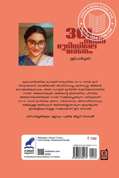 മൂകാംബികയിലെ ഹോട്ടല് മൗര്യയിലെ 301-ാം നമ്പര് മുറി. നിഗൂഢതകള് ബാക്കിയാക്കി അവിടെവെച്ചു മരണപ്പെട്ട അജയന്. മാസങ്ങള്ക്കുശേഷം അതേ ഹോട്ടല് മുറിയില് താമസിക്കാനെത്തിയ സായി. അജയനിലേക്ക്, അജയന്റെ മരണത്തിനു പിന്നിലെ അജ്ഞാതത്വത്തിലേക്ക് സായി സഞ്ചരിച്ചെത്തുന്ന വഴിദൂരമാണ് 301-ാം നമ്പര് മുറിയിലെ മരണം. വിശ്വാസവും അന്ധവിശ്വാസവും തമ്മിലുള്ള അതിരുകള് അലിഞ്ഞില്ലാതാകുന്ന ഇരുള്മൂടിയ ഇടങ്ങളിലൂടെയുള്ള സഞ്ചാരമാണ് ഈ നോവല്.Write a review on this book!. Write Your Review about 301-ാം നമ്പര് മുറിയിലെ മരണം Other InformationThis book has been viewed by users 27 times