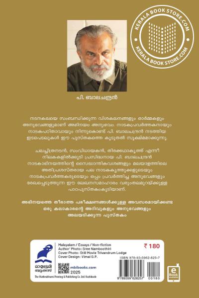 ചലച്ചിത്രനടന്, സംവിധായകന്, തിരക്കഥാകൃത്ത് എന്നീ നിലകകളില്ക്കൂടി പ്രസിദ്ധനായ പി. ബാലചന്ദ്രന് നാടകാഭിനയത്തിന്റെ സൈദ്ധാന്തികവശങ്ങളും മലയാളത്തിലെ അതിപ്രശസ്തരായ പല നാടകകൃത്തുക്കളുടെയും നാടകപ്രവര്ത്തകരുടെയും ഒപ്പം പ്രവര്ത്തിച്ച അനുഭവങ്ങളും രേഖപ്പെടുത്തുന്ന ഈ ലേഖനസമാഹാരം വരുംതലമുറയ്ക്കുള്ള പാഠപുസ്തകംകൂടിയാണ്.