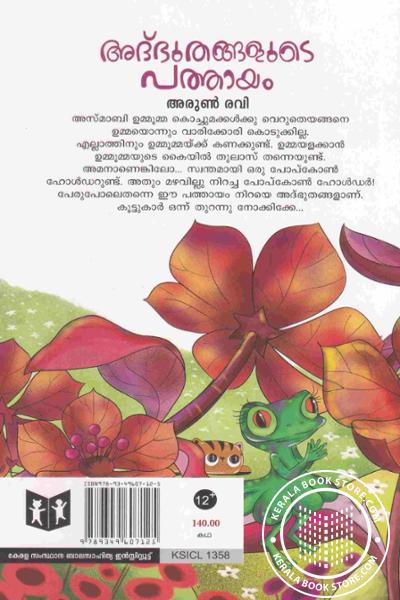 അസ്മാബി ഉമ്മൂമ്മ കൊച്ചുമക്കൾക്കു വെറുതെയങ്ങനെ ഉമ്മയൊന്നും വാരിക്കോരി കൊടുക്കില്ല. എല്ലാത്തിനും ഉമ്മൂമ്മയ്ക്ക് കണക്കുണ്ട്. ഉമ്മയളക്കാൻ ഉമ്മൂമ്മയുടെ കൈയിൽ തുലാസ് തന്നെയുണ്ട്. അമനാണെങ്കിലോ... സ്വന്തമായി ഒരു പോപ്കോൺ ഹോൾഡറുണ്ട്. അതും മഴവില്ലു നിറച്ച പോപ്കോൺ ഹോൾഡർ! പേരുപോലെതന്നെ ഈ പത്തായം നിറയെ അദ്ഭുതങ്ങളാണ്. കൂട്ടുകാർ ഒന്ന് തുറന്നു നോക്കിക്കേ...Write a review on this book!. Write Your Review about അദ്ഭുതങ്ങളുടെ പത്തായം  Other InformationThis book has been viewed by users 24 times