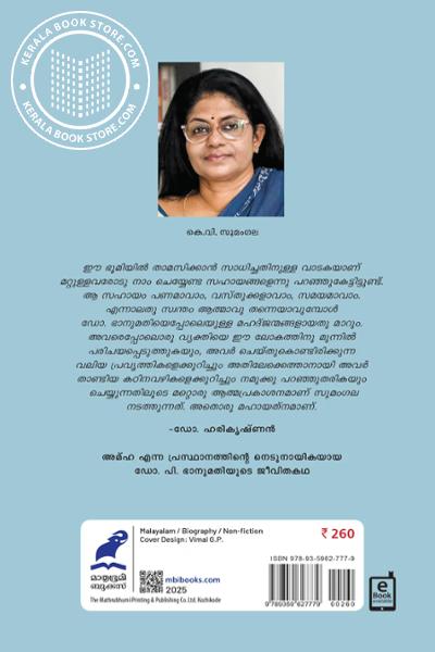 ഈ ഭൂമിയില് താമസിക്കാന് സാധിച്ചതിനുള്ള വാടകയാണ് മറ്റുള്ളവരോടു നാം ചെയ്യേണ്ട സഹായങ്ങളെന്നു പറഞ്ഞുകേട്ടിട്ടുണ്ട്. ആ സഹായം പണമാവാം, വസ്തുക്കളാവാം, സമയമാവാം. എന്നാലതു സ്വന്തം ആത്മാവു തന്നെയാവുമ്പോള് ഡോ. ഭാനുമതിയെപ്പോലെയുള്ള മഹദ്ജന്മങ്ങളായതു മാറും. അവരെപ്പോലൊരു വ്യക്തിയെ ഈ ലോകത്തിനു മുന്നില് പരിചയപ്പെടുത്തുകയും, അവര് ചെയ്തുകൊണ്ടിരിക്കുന്ന വലിയ പ്രവൃത്തികളെക്കുറിച്ചും അതിലേക്കെത്താനായി അവര് താണ്ടിയ കഠിനവഴികളെക്കുറിച്ചും നമുക്കു പറഞ്ഞുതരികയും ചെയ്യുന്നതിലൂടെ മറ്റൊരു ആത്മപ്രകാശനമാണ് സുമംഗല നടത്തുന്നത്. അതൊരു മഹായത്നമാണ്.