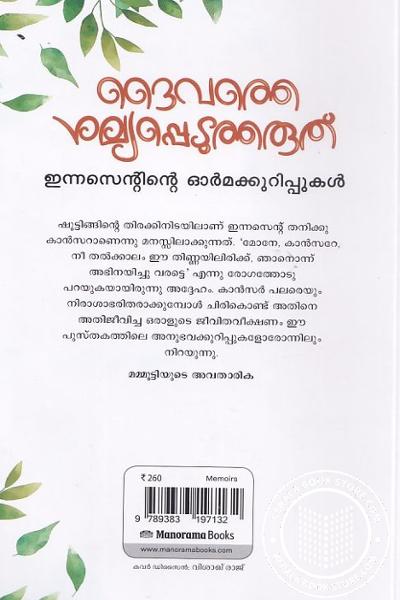 ഷൂട്ടിങ്ങിന്റെ ഇടയിലാണ് തനിക്ക് കാന്സറാണെന്ന് മനസ്സിലാക്കുന്നത് “മോനേ കാന്സറേ നീ തല്ക്കാലം ഈ തിണ്ണയിരിക്ക് ഞാനൊന്ന് അഭിനയിച്ചു വരട്ടെ“ എന്നു രോഗത്തോടു പറയുകയായിരുന്നു അദ്ദേഹം.കാന്സര് പലരെയും നിരാശാഭരിതരാക്കുമ്പോള് ചിരികൊണ്ട് അതിനെ അതിജീവിച്ച ഒരാളുടെ ജീവിതവീക്ഷണം ഈ പുസ്തകത്തിലെ അനുഭവക്കുറിപ്പുകളോരോന്നിലും നിറയുന്നു.Write a review on this book!. Write Your Review about ദൈവത്തെ ശല്യപ്പെടുത്തരുത് Other InformationThis book has been viewed by users 2882 times