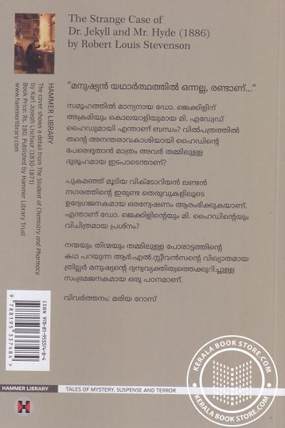 നന്മയും തിന്മയും തമ്മിലുള്ള പോരാട്ടത്തിന്റെ കഥ പറയുന്ന ആർ.എൽ.സ്റ്റീവൻസൻ്റെ വിഖ്യാതമായ ത്രില്ലർ മനുഷ്യൻ്റെ ദ്വന്ദ്വവ്യക്തിത്വത്തെക്കുറിച്ചുള്ള സംഭ്രമജനകമായ ഒരു പഠനമാണ്.Write a review on this book!. Write Your Review about ഡോ. ജെക്കിളും മി. ഹൈഡും Other InformationThis book has been viewed by users 6 times