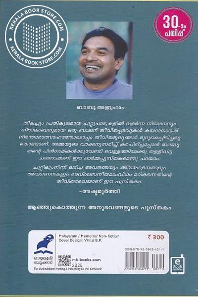 തികച്ചും പ്രതികൂലമായ ചുറ്റുപാടുകളില് വളര്ന്ന നിര്ദ്ധനനും നിരാലംബനുമായ ഒരു ബാലന് ജീവിതപ്പടവുകള് കയറാനായത് നിരന്തരോത്സാഹത്തോടൊപ്പം ജീവിതമൂല്യങ്ങള് മുറുകെപ്പിടിച്ചതുകൊണ്ടാണ്. അമ്മയുടെ വാക്കനുസരിച്ച് കരപിടിച്ചപ്പോള് ബാബു തന്റെ പിന്ഗാമികള്ക്കുവേണ്ടി വെള്ളത്തിലേക്കു തള്ളിവിട്ട ചങ്ങാടമാണ് ഈ ഓര്മ്മപ്പുസ്തകമെന്നു പറയാം. ചുറ്റിലും നിന്ന് ലഭിച്ച അവജ്ഞയും അവഹേളനങ്ങളും അവഗണനകളും അവിശ്വസനീയമാംവിധം മറികടന്നതിന്റെ ജീവിതരേഖയാണ് ഈ പുസ്തകം.