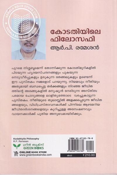 പുറമെ നിശ്ശബ്ദമെന്ന് തോന്നിക്കുന്ന കോടതിമുറികളിൽ പിടയുന്ന ഹൃദയസ്പന്ദനങ്ങളും പുകയുന്ന നെടുവീർപ്പുകളും ഉരുകുന്ന തേങ്ങലുകളും ഉണ്ടെന്ന് ഈ പുസ്തകം നമ്മളോട് പറയുന്നു. നിയമവും നീതിയും അതുമായി ബന്ധപ്പെട്ട തർക്കങ്ങളും നിറഞ്ഞ ജീവിത ത്തിൻ്റെ അരങ്ങുകളിൽ മനുഷ്യൻ നേരിടുന്ന അസ്തിത്വ പരമായ ചോദ്യങ്ങളെ ലാളിത്യത്തോടെ വരച്ചുകാട്ടുന്ന പുസ്തകം. നീതിയുടെ തുലാസ്സിൽ അളക്കപ്പെടുന്ന ജീവിത ങ്ങളെയും, വിധിപ്രസ്താവനകൾക്ക് പിന്നിലെ ആഴമേറിയ ജീവിതദർശനങ്ങളെയും കുറിച്ചുള്ള അന്വേഷണവും വായനക്കാർക്ക് പുതിയ അനുഭവമായിരിക്കും.Write a review on this book!. Write Your Review about കോടതിയിലെ ഫിലോസഫി Other InformationThis book has been viewed by users 5 times