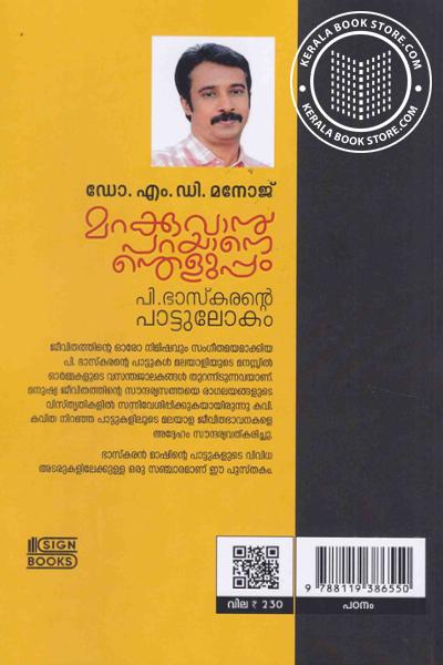 ഭാസ്കരൻ മാഷിൻ്റെ പാട്ടുകളുടെ വിവിധ അടരുകളിലേക്കുള്ള ഒരു സഞ്ചാരമാണ് ഈ പുസ്തകം.Write a review on this book!. Write Your Review about മറക്കുവാൻ പറയാനെന്തെളുപ്പം പി.ഭാസ്ക്കരൻ പാട്ടുലോകം Other InformationThis book has been viewed by users 11 times
