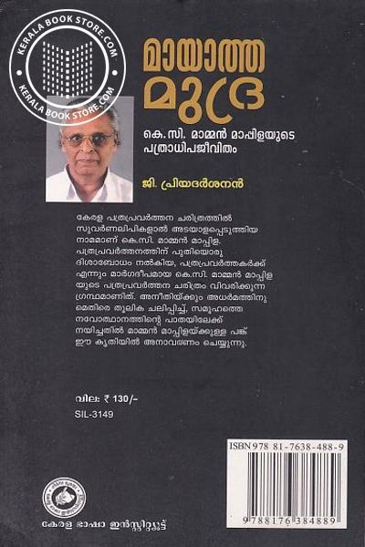 സുവർണലിപികളാൽ അടയാളപ്പെടുത്തിയ നാമമാണ് കെ.സി. മാമ്മൻ മാപ്പിള പത്രപ്രവർത്തനത്തിന് പുതിയൊരു ദിശാബോധം നൽകിയ, പത്രപ്രവർത്തകർക്ക് എന്നും മാർഗദീപമായ കെ.സി. മാമ്മൻ മാപ്പിള യുടെ പത്രപ്രവർത്തന ചരിത്രം വിവരിക്കുന്ന ഗ്രന്ഥമാണിത്. അനീതിയ്ക്കും അധർമത്തിനു മെതിരെ തൂലിക ചലിപ്പിച്ച്, സമൂഹത്തെ നവോത്ഥാനത്തിന്റെ പാതയിലേക്ക് നയിച്ചതിൽ മാമ്മൻ മാപ്പിളയ്ക്കുള്ള പത് ഈ കൃതിയിൽ അനാവരണം ചെയ്യുന്നു.Write a review on this book!. Write Your Review about മായാത്ത മുദ്ര -കെ.സി. മാമ്മൻ മാപ്പിളയുടെ പത്രാധിപജീവിതം Other InformationThis book has been viewed by users 5 times