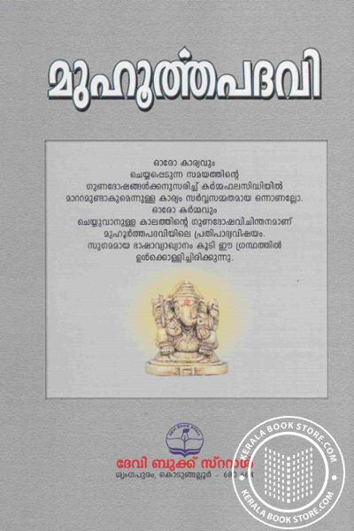 ചെയ്യുവാനുള്ള കാലത്തിൻ്റെ ഗുണദോഷവിചിന്തനമാണ് മുഹൂർത്തപദവിയിലെ പ്രതിപാദ്യവിഷയം. സുഗമമായ ഭാഷാവ്യാഖ്യാനം കൂടി ഈ ഗ്രന്ഥത്തിൽ ഉൾക്കൊള്ളിച്ചിരിക്കുന്നു.Write a review on this book!. Write Your Review about മുഹൂര്ത്തപദവി Other InformationThis book has been viewed by users 12 times