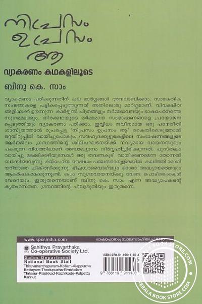 വ്യാകരണം പഠിക്കുന്നതിന് പല മാര്ഗ്ഗങ്ങള് അവലംബിക്കാം. സാങ്കേതികസംജ്ഞകളെ പട്ടികപ്പെടുത്തുന്നത് അതിലൊരു മാര്ഗ്ഗമാണ്. വിവക്ഷിതങ്ങളിലേക്ക് ഊന്നുന്ന കാര്ട്ടൂണ് ചിത്രങ്ങളും നര്മ്മഭാവനയും ഭാഷാപഠനത്തെ സുഗമമാക്കും. തിരക്കഥയുടെ മര്മ്മമായ സംഭാഷണങ്ങളെ പ്രയോജനപ്പെടുത്തിയും വ്യാകരണം പഠിക്കാം. ഇവ്വിധം നവീനമായ ഒരു പഠനരീതി ശാസ്ത്രത്താല് രൂപപ്പെട്ട നിപ്രസം ഉപ്രസം ആ കയ്യിലെടുത്താല് ഒറ്റയിരുപ്പില് വായിച്ചുപോകും. സൗഹൃദക്കൂട്ടുകെട്ടിലെ സംഭാഷണങ്ങളുടെ ആര്ജ്ജവം ഗ്രന്ഥത്തിന്റെ ശില്പഘടനയ്ക്ക് നവ്യമായ വായനസുഖം പകരുന്ന വിധത്തിലാണ് അന്വാഖ്യാനം നിര്വ്വഹിച്ചിരിക്കുന്നത്. പുസ്തകം വായിച്ചു മടക്കിക്കഴിയുമ്പോള് ഒരു തവണകൂടി വായിക്കണമെന്ന തോന്നല് ബാക്കിയാവുന്നു. കയ്പേറിയ ഔഷധം പഞ്ചസാരഗുളികയില് കലര്ത്തി രോഗിയറിയാതെ ചികിത്സിക്കുന്നു. ഭിഷഗ്വരവൈദഗ്ദ്ധ്യം ഓരോ അദ്ധ്യായത്തെയും ആകര്ഷകമാക്കുന്നുണ്ട്. ഒപ്പം സുഗമവായനയ്ക്കു വേണ്ട പൊടിക്കൈകള് വേറെയും. ഇതുതന്നെയാണ് ബിനു. കെ സാം എന്ന അദ്ധ്യാപകന്റെ കൃതഹസ്തത. ഗ്രന്ഥത്തിന്റെ ഫലശ്രുതിയും ഇതുതന്നെ.Write a review on this book!. Write Your Review about നിപ്രാസം ഉപ്രാസം Other InformationThis book has been viewed by users 144 times