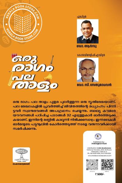 32 എഴുത്തുകാരുടെ ആത്മകഥ ഒരേ പുസ്തകത്തിൽ അച്ചടിച്ചു വരുന്ന അപൂർവ്വതയാണ് 29.11.25 ന് രാവിലെ 10 മണിക്ക് കോഴിക്കോട് അളകാപുരിയിൽ നടക്കാൻ പോകുന്നത്. “ഒരേ രാഗം ഒരേ താളം“ എന്ന 500 ളം പേജിൽ വിന്യസിച്ചിരിക്കുന്ന കൃതി ഇന്ത്യൻ സാഹിത്യ ചരിത്രത്തിലെ അത്യപൂർവ്വതയായി മാറുകയാണ് പ്രകാശനത്തിലൂടെ. കവി പി.പി.ശ്രീധരനുണ്ണി മുതൽ, ഡോ. ആർസു തൊട്ട് നിരൂപകരും ഗാന്ധിയന്മാരും കഥാകൃത്തുക്കളും വിവർത്തകരും അണിനിരക്കുന്ന ഇത്തരമൊരു കൃതി ആദ്യമായി വെളിച്ചം കാണുകയാണ്.Write a review on this book!. Write Your Review about ഒരു രാഗം പല താളം Other InformationThis book has been viewed by users 9 times