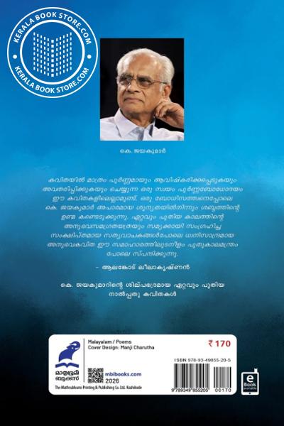 കവിതയില് മാത്രം പൂര്ണ്ണമായും ആവിഷ്കരിക്കപ്പെടുകയും അവതരിപ്പിക്കുകയും ചെയ്യുന്ന ഒരു സ്വയം പൂര്ണ്ണബോധോദയം ഈ കവിതകളിലെല്ലാമുണ്ട്. ഒരു ബോധിസത്ത്വനെപ്പോലെ കെ. ജയകുമാര് അപാരമായ ശൂന്യതയില്നിന്നും ശബ്ദത്തിന്റെ ഉണ്മ കണ്ടെടുക്കുന്നു. ഏറ്റവും പുതിയ കാലത്തിന്റെ അനുഭവസമഗ്രതയത്രയും സമ്യക്കായി സംഗ്രഹിച്ച സംക്ഷിപ്തമായ സത്യവാചകങ്ങള്പോലെ ധ്വനിസാന്ദ്രമായ അനുഭവകവിത ഈ സമാഹാരത്തിലുടനീളം പുതുകാലമന്ത്രം പോലെ സ്പന്ദിക്കുന്നു.