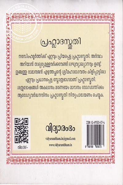 നരസിംഹമൂർത്തിക്കു് ഏറ്റവും പ്രിയപ്പെട്ട പ്രഹ്ലാദസ്തുതി അർത്ഥം അറിയാൻ താല്പര്യമുള്ളവർക്കുവേണ്ടി ലഘുവ്യാഖ്യാനവും ഉണ്ടു്. തുഞ്ചത്തു രാമാനുജൻ എഴുത്തച്ഛൻ്റെ ശ്രീമഹാഭാഗവതം കിളിപ്പാട്ടിലെ ഏറ്റവും പ്രധാനപ്പെട്ട സ്തോത്രഭാഗമാണു് പ്രഹ്ലാദസ്തുതി. ശത്രുദോഷങ്ങൾ അകലാനും മരണഭയം മാറാനും രോഗശാന്തിക്കും ആരോഗ്യവർദ്ധനവിനും പ്രഹ്ലാദസ്തുതി നിത്യപാരായണം ചെയ്യുകWrite a review on this book!. Write Your Review about പ്രഹ്ലാദസ്തുതി Other InformationThis book has been viewed by users 7 times