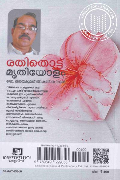 വിജ്ഞാന സമുദ്രത്തെ ഒരു കൊച്ചു ചിമിഴിയിലൊതുക്കാനുള്ള ശ്രമമാണ് ഈ പുസ്തകത്തിൽ. കഥാനുറുങ്ങുകൾ എന്നോ, ലേഖനങ്ങൾ എന്നോ, നിരീക്ഷണങ്ങൾ എന്നോ വിശേഷിപ്പിക്കാം. ശുദ്ധസാഹിത്യം മുതൽ സങ്കീർണമായ സൈദ്ധാന്തിക തത്വങ്ങൾവരെ ഗ്രന്ഥകാരൻ വിശദമായി ചർച്ച ചെയ്യുന്നു. അഗാധമായ ജ്ഞാനം, നിരീക്ഷണപാടവം, പാരായണക്ഷമത ഇതു മൂന്നും ഒത്തിണങ്ങുന്ന ഓരോ ലേഖനവും ഈടുറ്റതാണ്.Write a review on this book!. Write Your Review about രതിതൊട്ട് മൃതിയോളം Other InformationThis book has been viewed by users 59 times