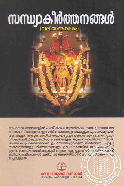 ഹൈന്ദവ ഭവനങ്ങളിൽ പണ്ട് കാലം മുതൽക്കെ സന്ധ്യാസമയത്ത് ഭഗവൽ സ്തോത്രങ്ങളും കീർത്തനങ്ങളും ചൊല്ലുക എന്നൊരു പതിവുണ്ടല്ലോ. കുടുംബത്തിൽ ഐശ്വര്യവും ആനന്ദവും ചൈതന്യവും നിറഞ്ഞുനിൽക്കുന്നതിനു വേണ്ടിയുള്ള ആചാരംകൂടിയാണ് അത്. അത്തരം പ്രാർത്ഥനയ്ക്ക് ഉപയോഗിച്ചുവരുന്ന മിക്കവാറും എല്ലാ സ്തോത്രങ്ങളും കീർത്തനങ്ങളും ഈ ഗ്രന്ഥത്തിൽ ഉൾക്കൊള്ളിച്ചിട്ടുണ്ട്. പ്രായമായവർക്കുകൂടി വളരെ വളരെ എളുപ്പത്തിൽ എളുപ്പത്തി വായിക്കുവാൻ കഴിയുന്നവിധത്തിൽ വലിയ അക്ഷരത്തിലാണ് ഈ പുസ്തകം അച്ചടിച്ചിട്ടുള്ളത്.Write a review on this book!. Write Your Review about സന്ധ്യാകീർത്തനങ്ങൾ -വലിയ അക്ഷരം- Other InformationThis book has been viewed by users 6 times