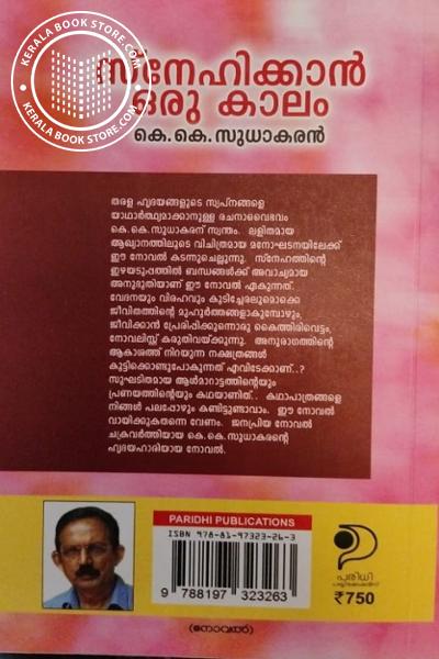 തരള ഹൃദയങ്ങളുടെ സ്വപ്നങ്ങളെ യാഥാർത്ഥ്യമാക്കാനുള്ള രചനാവൈഭവം കെ.കെ.സുധാകരന് സ്വന്തം. ലളിതമായ ആഖ്യാനത്തിലൂടെ വിചിത്രമായ മനോഘടനയിലേക്ക് ഈ നോവൽ കടന്നുചെല്ലുന്നു. സ്നേഹത്തിന്റെ ഇഴയടുപ്പത്തിൽ ബന്ധങ്ങൾക്ക് അവാച്യമായ അനുഭൂതിയാണ് ഈ നോവൽ ഏകുന്നത്. വേദനയും വിരഹവും കൂടിച്ചേരലുമൊക്കെ ജീവിതത്തിൻ്റെ മുഹൂർത്തങ്ങളാകുമ്പോഴും, ജീവിക്കാൻ പ്രേരിപ്പിക്കുന്നൊരു കൈത്തിരിവെട്ടം, നോവലിസ്റ്റ് കരുതിവയ്ക്കുന്നു. അനുരാഗത്തിന്റെ ആകാശത്ത് നിറയുന്ന നക്ഷത്രങ്ങൾ കുട്ടിക്കൊണ്ടുപോകുന്നത് എവിടേക്കാണ്..? സുഘടിതമായ ആൾമാറാട്ടത്തിൻ്റെയും പ്രണയത്തിന്റെയും കഥയാണിത്.. കഥാപാത്രങ്ങളെ നിങ്ങൾ പലപ്പോഴും കണ്ടിട്ടുണ്ടാവാം. ഈ നോവൽ വായിക്കുകതന്നെ വേണം. ജനപ്രിയ നോവൽ ചക്രവർത്തിയായ കെ. കെ. സുധാകരൻ്റെ ഹൃദയഹാരിയായ നോവൽ.Write a review on this book!. Write Your Review about സ്നേഹിക്കാൻ ഒരു കാലം Other InformationThis book has been viewed by users 7 times