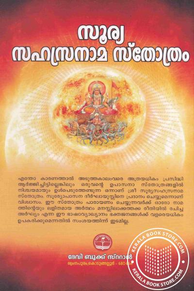 എന്തോ കാരണത്താൽ അടുത്തകാലംവരെ അത്രയധികം പ്രസിദ്ധി ആർജ്ജിച്ചിട്ടില്ലെങ്കിലും ഒരുവൻ്റെ ഉപാസനാ സ്തോത്രങ്ങളിൽ നിശ്ചയമായും ഉൾപെടുത്തേണ്ടുന്ന ഒന്നാണ് ശ്രീ സൂര്യസഹസ്രനാമ സ്തോത്രം. സൂര്യോപാസന ദീർഘായുസ്സിനെ പ്രദാനം ചെയ്യുമെന്നാണ് വിശ്വാസം. ഈ സ്തോത്രം പാരായണം ചെയ്യുന്നവർക്ക് ഓരോ നാമത്തിന്റെയും ലളിതമായ അർത്ഥം മനസ്സിലാക്കത്തക്ക രീതിയിൽ രചിച്ച അർഘ്യം എന്ന ഈ ഭാഷാവ്യാഖ്യാനം ഭക്തജനങ്ങൾക്ക് വളരെയധികം ഉപകരിക്കുമെന്നതിൽ സംശയത്തിന്ന് ഇടമില്ല.Write a review on this book!. Write Your Review about സൂര്യ സഹസ്രനാമസ്തോത്രം Other InformationThis book has been viewed by users 4 times