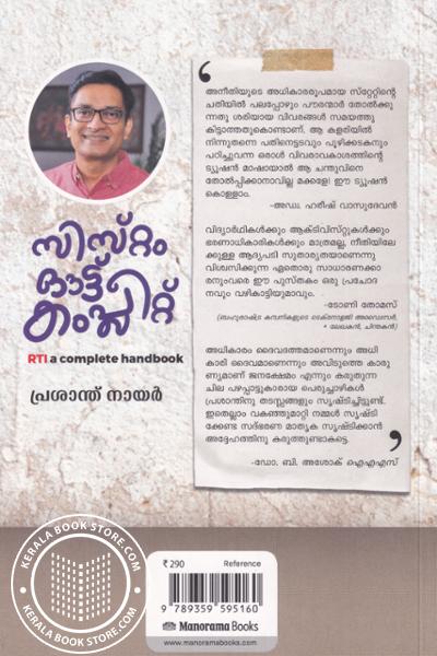 ഏത് ഏമാൻമാരോടും ചോദ്യങ്ങൾ ചോദിക്കാനും മറുപടി ആവശ്യപ്പെടാനും നീതി ഉറപ്പാക്കാനും സാധാരണ പൗരന് അധികാരം ഉറപ്പാക്കുന്നതാണ് വിവരാവകാശ നിയമം(RTI). ഇവിടെയും പഴുതുകൾ ഉപയോഗിച്ചു രക്ഷപ്പെടുന്ന ഉദ്യോഗസ്ഥപ്രഭുക്ക ളുണ്ട്. ഇനി അതു നടക്കില്ല. സിസ്റ്റത്തിനുള്ളിൽ പ്രവർത്തിച്ച് അതിനുള്ളിലെ കളികൾ മനസ്സിലാക്കിയ ഒരു ഉദ്യോഗസ്ഥന്റെ അനുഭവപാഠങ്ങൾ. അപേക്ഷ തയാറാക്കുന്ന വിധം. ചോദ്യങ്ങൾ ഉന്നയിക്കേണ്ട വിധം വിവരാവകാശ കമ്മിഷനിൽ പരാതി സമർപ്പിക്കേണ്ട രൂപരേഖ. അപേക്ഷയ്ക്കു മറുപടി വൈകിയാൽ, നിരസിച്ചാൽ, വിവരം ലഭ്യമല്ല എന്ന പ്രതികരണം ലഭിച്ചാൽ എന്തുചെയ്യണം? വിവരാവകാശനിയമം ആരും നൂലിൽ കെട്ടിയിറക്കിയതല്ല. ദാനം നൽകിയതുമല്ല. സമൂഹത്തിന്റെ ഏറ്റവും താഴേത്തട്ടിൽ നിന്നുയർന്നുവന്ന പോരാട്ടങ്ങളുടെ അനന്തരഫലമാണ്. തിരുവായ്ക്ക് എതിർവായുണ്ടെന്ന് അധികാരകേന്ദ്രങ്ങളെ ബോധ്യപ്പെടുത്തിയ ഇന്ത്യൻ ജനാധിപത്യത്തിന്റെ ഈ മഹാവകാശം എങ്ങനെ ബുദ്ധിപൂർവം വിനിയോഗിക്കണമെന്ന് പ്രശാന്ത് നായർ IAS ലളിതമായി വിവരിക്കുന്നു.Write a review on this book!. Write Your Review about സിസ്റ്റം ഔട്ട് കംപ്ലീറ്റ് Other InformationThis book has been viewed by users 141 times