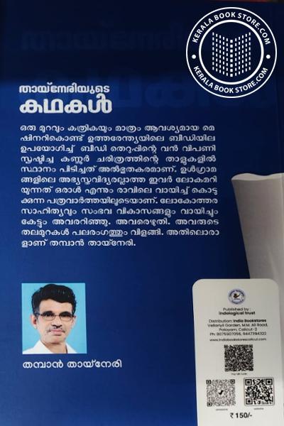 ബീഡിയുടെ ചരിത്രത്തോടൊപ്പം കണ്ണൂർ കോൾമയിർക്കൊള്ളുന്ന നാടാണ്. ബീഡിപ്പണിക്കിടയിൽ പഠിച്ച് വായിച്ച് കേട്ടറിഞ്ഞ കഥകൾ പറയുന്ന പയ്യന്നൂരിലെ തമ്പാൻ തായിനേരി എഴുതിയ കഥകൾ ചരിത്രത്തോടൊപ്പം സഞ്ചരിക്കും. മുഖചിത്രം അതാണ് പറയുന്നത്. പിൻകുറിപ്പ് പോലും എടുത്ത് പറയുന്ന കഥാതന്തു ഹൃദയാവജ്രകമാണ്. ബീഡി തെറുപ്പുകാരന്റെ കുറ്റിയറ്റ കഥകൾ.Write a review on this book!. Write Your Review about തായ്നേരിയുടെ കഥകൾ Other InformationThis book has been viewed by users 1 times