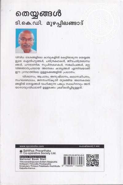 വിശ്വാസം, ആചാരം, അനുഷ്ഠാനം, കലാസമീപനം, സംഘബോധം, ജനസംസ്കൃതി തുടങ്ങിയ അനേകതല ങ്ങളിൽ തെയ്യങ്ങൾ വഹിക്കുന്ന പങ്കും സ്വാധീനവും അറി യാനാവുംവിധമാണ് ഉള്ളടക്കം ക്രമീകരിച്ചിട്ടുള്ളത്.Write a review on this book!. Write Your Review about തെയ്യങ്ങൾ Other InformationThis book has been viewed by users 8 times