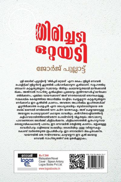 ശ്രീ ജോർജ് പുല്ലാട്ടിൻ്റെ ’ തിരിച്ചടി ഒറ്റയടി’ എന്ന കൈം ത്രില്ലർ നോവൽ പൊളിറ്റിക്ക് ത്രില്ലറിൻ്റെ കൂട്ടത്തിൽ പരിഗണിക്കാവുന്ന കൃതിയാണ്. സമൂഹത്തിലുണ്ടാകുന്ന കുറ്റകൃത്യങ്ങളുടെ സ്വഭാവവും രീതിയും കാലാനുസൃതമായി മാറിക്കൊണ്ടിരിക്കും. അതിനാൽ സാഹിത്യ കൃതികളിലെ പ്രമേയവും ഇതിനനുസരിച്ച് മാറിക്കൊണ്ടിരിക്കണം. എങ്കിലേ വായനക്കാരന് അത് നേരനുഭവമായി തോന്നുകയുള്ളു. സമകാലിക കേരളത്തിലെ അധാർമ്മിക രാഷ്ട്രീയം ചെയ്യുകൂട്ടുന്ന കുറ്റകൃത്യങ്ങളുടെ നേർക്കാഴ്ച ഈ കൃതിയിൽ കാണാം. അവരുടെ അധാർമ്മിക ഇംഗിതങ്ങൾക്ക് കൂട്ടുനിൽക്കാത്ത പോളച്ചൻ എന്ന ധൈര്യശാലിയും ബുദ്ധിശാലിയുമായ ഒരു ബാങ്ക് മാനേജർ നേരിടേണ്ടി വന്ന കഠിന യാതനകളും അത് ചെയ്തവരോടുള്ള അയാളുടെ പോരാട്ടവുമാണ് കഥയുടെ ഭാവശില്പം. കുൽസിതരാഷ്ട്രീയത്തിന്റെ കളിപ്പാവയായിത്തീരേണ്ടിവരുന്ന പോലീസിൻ്റെ വികൃതമുഖം അസാമാന്യ പാടവത്തോടെ ജോർജ്ജ് ചിത്രീകരിക്കുന്നു. ചിത്രീകരണത്തിൽ കൃതഹസ്തനായ ഒരാഖ്യായികാകാരൻ്റെ പാടവം ഈ നോവലിൽ തെളിഞ്ഞു കാണാം. ഒതുക്കമുള്ള ഭാവശില്പവും ലളിതമായ ഭാഷയിലും ശൈലിയിലും ഉള്ള വർണ്ണനകളും കൊണ്ട് വാർത്തെടുത്ത രൂപശിൽപവും ഈ നോവലിനെ മികച്ചതാക്കുന്നു. വായനയിൽ ഒരു നവിനാനുഭവം കാഴ്ചവയ്ക്കുന്ന ഈ കൃതി മലയാള നോവൽ സാഹിത്യത്തിന് ഒരു മുതൽക്കൂട്ടാകും.Write a review on this book!. Write Your Review about തിരിച്ചടി ഒറ്റയടി Other InformationThis book has been viewed by users 13 times