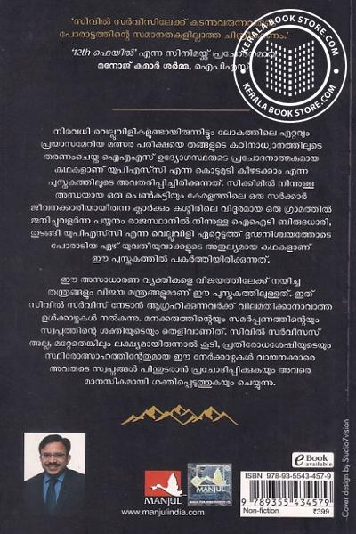 ഈ അസാധാരണ വ്യക്തികളെ വിജയത്തിലേക്ക് നയിച്ച തന്ത്രങ്ങളും വിജയ മന്ത്രങ്ങളുമാണ് ഈ പുസ്തകത്തിലുള്ളത്. ഇത് സിവിൽ സർവീസ് നേടാൻ ആഗ്രഹിക്കുന്നവർക്ക് വിലമതിക്കാനാവാത്ത ഉൾക്കാഴ്ചകൾ നൽകുന്നു. മനക്കരുത്തിന്റെയും സമർപ്പണത്തിന്റെയും സ്വപ്നത്തിന്റെ ശക്തിയുടെയും തെളിവാണിത്. സിവിൽ സർവീസസ് അല്ല, മറ്റേതെങ്കിലും ലക്ഷ്യമായിരുന്നാൽ കൂടി, പ്രതിരോധശേഷിയുടെയും സ്ഥിരോത്സാഹത്തിൻ്റേതുമായ ഈ നേർക്കാഴ്ചകൾ വായനക്കാരെ അവരുടെ സ്വപ്നങ്ങൾ പിന്തുടരാൻ പ്രചോദിപ്പിക്കുകയും അവരെ മാനസികമായി ശക്തിപ്പെടുത്തുകയും ചെയ്യുന്നു.Write a review on this book!. Write Your Review about UPSC എന്ന കൊടുമുടി കീഴടക്കാം Other InformationThis book has been viewed by users 10 times