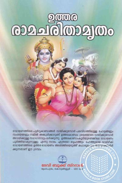 രാമായണത്തിലെ പൂർവ്വകാണ്ഡങ്ങൾ വായിക്കുമ്പോൾ പലവിധത്തിലുള്ള ചോദ്യങ്ങളും സംശയങ്ങളും നമ്മിൽ അങ്കുരിക്കാറുണ്ട്. ഉത്തരകാണ്ഡം ശ്രദ്ധയോടെ വായിക്കുമ്പോൾ അവയ്ക്കുള്ള സമാധാനവും ലഭിക്കുന്നു. ഉത്തരകാണ്ഡംകൂടിയുണ്ടെങ്കിലേ രാമായണം പൂർത്തിയാകുന്നുള്ളു എന്നു സാരം. എത്രയോ ബൃഹത്തും മഹത്തുമായ വാല്മീകി രാമായണത്തിലെ ഉത്തര രാമായണം അടർത്തിയെടുത്ത് കഥാരൂപേണ തയ്യാറാക്കിയിരിക്കുന്നതാണ് ഈ ഗ്രന്ഥം.Write a review on this book!. Write Your Review about ഉത്തരരാമചരിതാമൃതം Other InformationThis book has been viewed by users 3 times