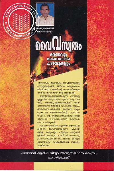 മരണകാലത്തിൽ തുടങ്ങി ആണ്ടുബ ലിയിൽ അവസാനിക്കുന്ന പ്രക്രിയ കളെ അടുക്കും ചിട്ടയും വരുത്തി ഇതിൽ വേണുഗോപാൽ ദർശനാചാര്യ പ്രതിപാദിച്ചിരിക്കുന്നു. ഓരോ ഹിന്ദുഭവനത്തിലും സൂക്ഷിക്കേണ്ട അമൂല്യ പുസ്തകം.Write a review on this book!. Write Your Review about വൈവസ്വതം Other InformationThis book has been viewed by users 6 times