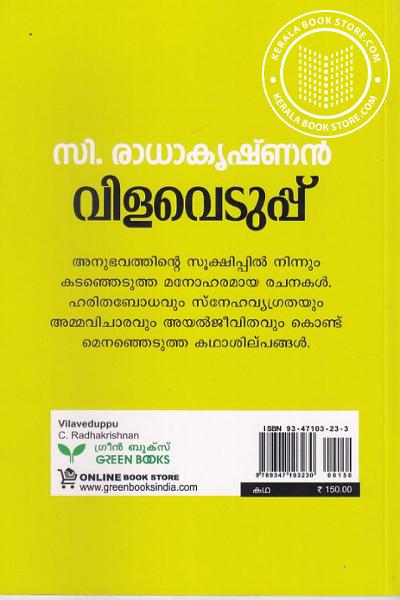 ഹരിതബോധവും സ്നേഹവ്യഗ്രതയും അമ്മവിചാരവും അയൽജീവിതവും കൊണ്ട് മെനഞ്ഞെടുത്ത കഥാശില്പങ്ങൾ.Write a review on this book!. Write Your Review about വിളവെടുപ്പ് Other InformationThis book has been viewed by users 4 times